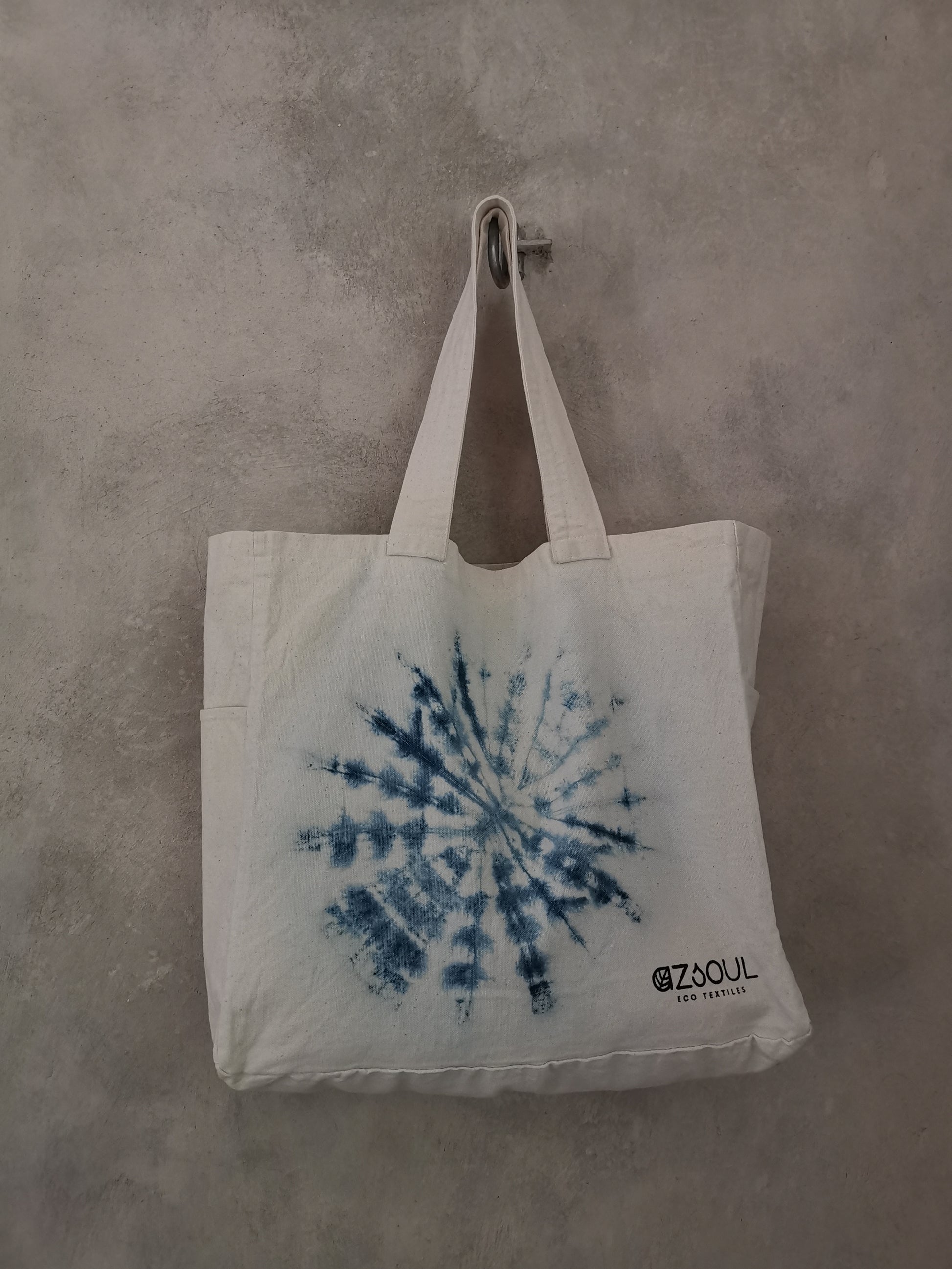 BOLSA XL TEÑIDA A MANO CON TINTES NATURALES, INDIGO. Elaborada con la técnica de Shibori. Cada bolsa es única y cuenta su propia historia, también aportando un poco al planeta por ser ecofriendly. Tela Loneta 100% algodón, tiene dos bolsillos en los costados para poder llevar tu agua, libros, bronceador, sombrilla, alimentos, etc. y en el interior un bolsillo pequeño para tener tu teléfono a la mano.